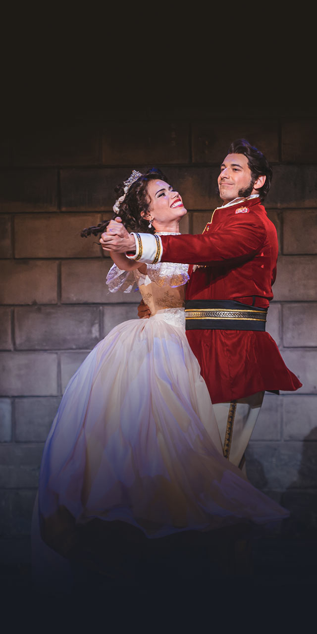 Ramiro is smitten with the newly arrived guest. He overhears Cinderella refusing Dandini’s attentions because she loves his ‘valet’ and delightedly steps forth to declare himself. Cinderella gives him one of a pair of matching bracelets, saying he will find her wearing its twin. Then she rushes away. After she leaves, Ramiro relinquishes his false identity and vows to find her. Dandini, now reduced to his former servant status, smashes Magnifico’s dreams of grandeur and turns him out of the palace.