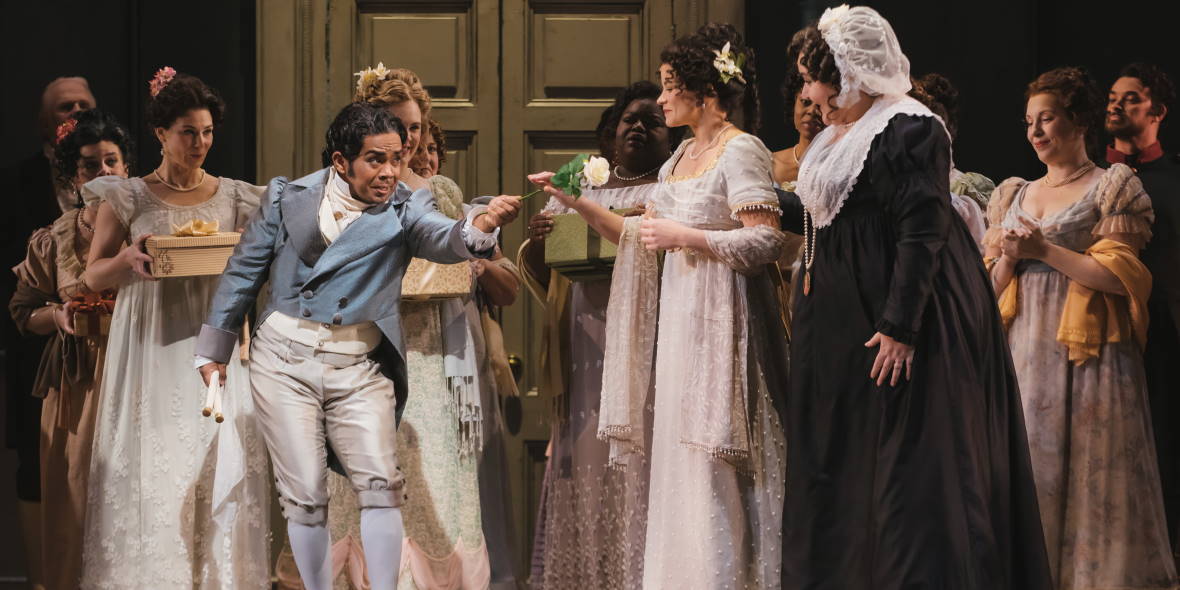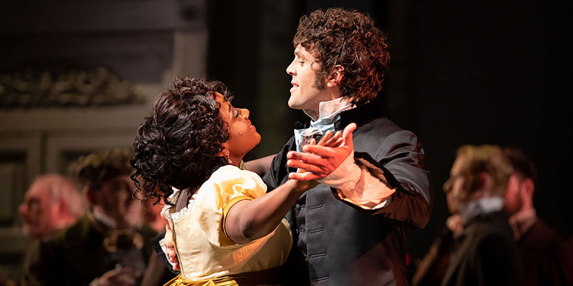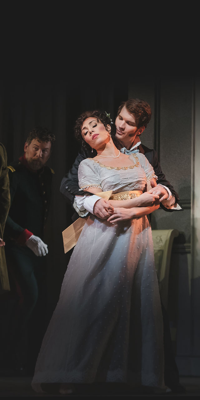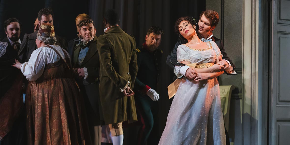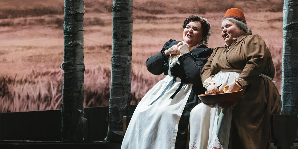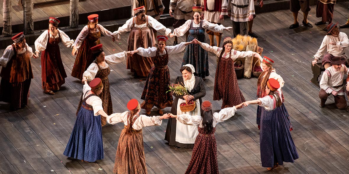 At her country estate, Madame Larina and nurse Filipevna can hear Larina’s two daughters, Tatyana and Olga, sing a song about love. Larina begins to reminisce about her own marriage to a man she did not love; “The good Lord sends us habit as a substitute for happiness,” she concludes. The workers on the estate sing and dance to celebrate the harvest. Tatyana is lost in the romantic literature she loves, while her younger, more carefree sister Olga wants to join the celebration. Larina warns Tatyana that real life is different from her stories. Filipevna announces that two young men have arrived: Olga’s fiancé Lensky, a poet, and his new friend Eugene Onegin. Tatyana is immediately attracted to Onegin, who tells her he has inherited a nearby estate and how dull he finds life in the country. Filipevna recognizes the effect Onegin has on Tatyana.