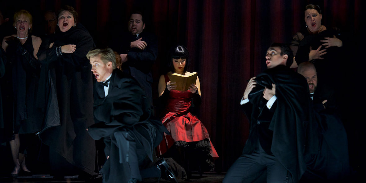At a society event, guests await the arrival of Violetta Valéry, the city’s most sophisticated high-society courtesan. Violetta is dying, and the cruel voyeurs are eager to witness Violetta’s demise. The crowd foists a new admirer on her: a young, socially awkward bookworm named Alfredo Germont. But he lectures the prostitute, telling her that she should lead a respectable life in which love reigns supreme. She tries to dismiss his ideas as naïve and impractical, but reassesses her life, renounces her lifestyle, and moves to the country with Alfredo.