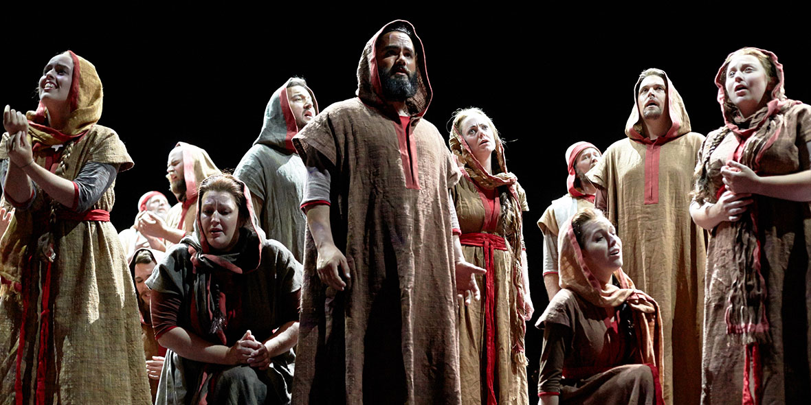 On the banks of the Euphrates. A chain-gang of enslaved Hebrews rests from forced labor, and in the great chorus "Va, pensiero," their thoughts turn to their beloved Zion. Zaccaria inspires them with a prophecy of the destruction of Babylon and the holy fire of courage.