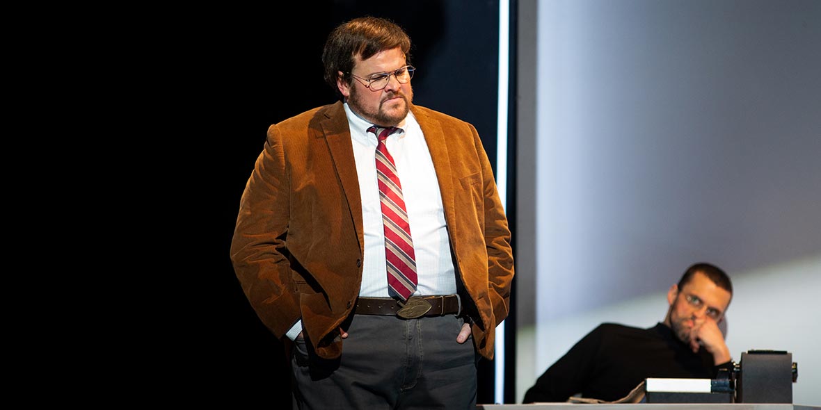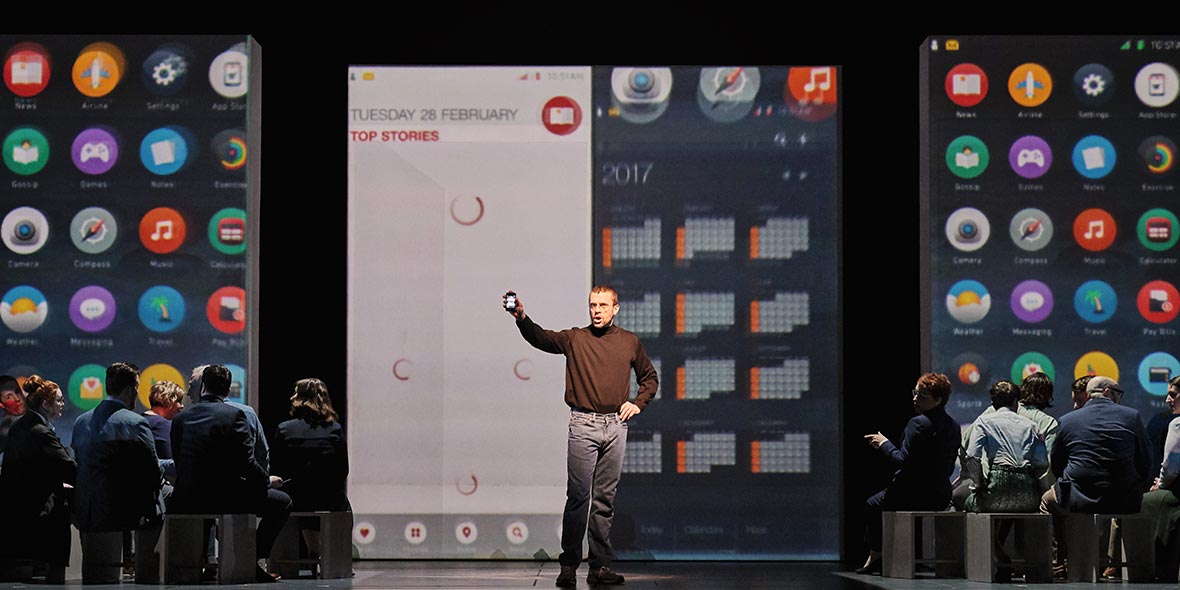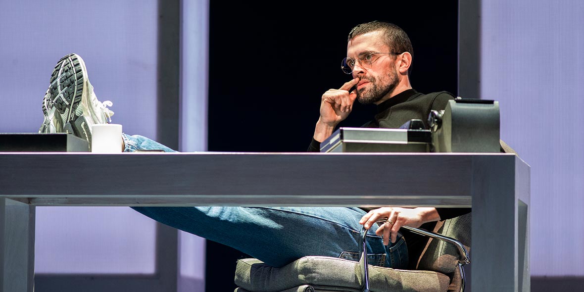 An adult Steve Jobs delivers a public launch of his company’s new product—“one device”—that will revolutionize technology. He ends his pitch noticeably weak and short of breath.