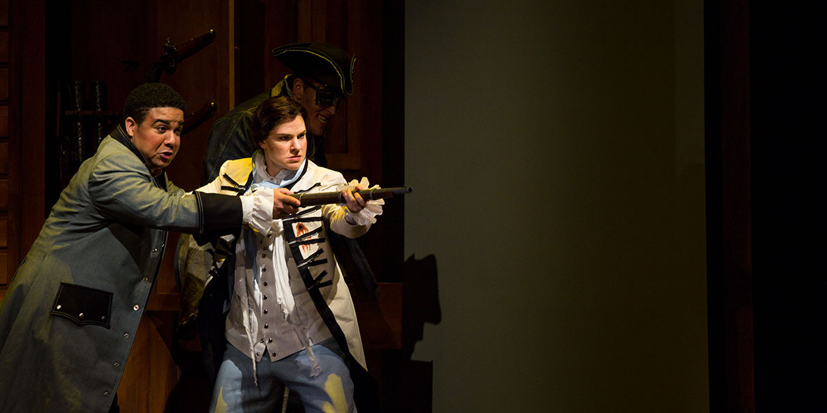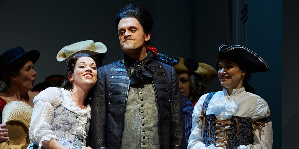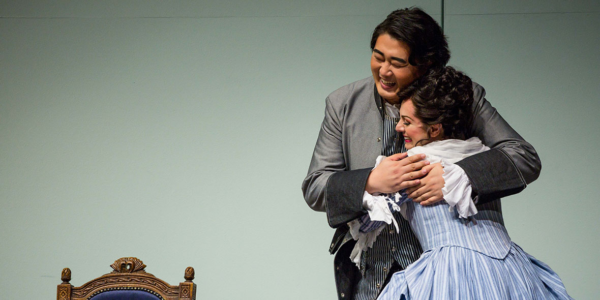 The teenage page Cherubino wants Susanna to plead on his behalf with the Countess to reinstate him in the Count's good graces—the Count has banished Cherubino from the castle after finding him with the gardener Antonio's daughter, Barbarina. They hear the Count approaching, and Cherubino hides. The Count attempts to arrange an assignation with Susanna, and he, too, hides when Don Basilio, the music teacher, arrives. When Basilio gossips about Cherubino's crush on the Countess, the jealous Count steps forward. He is telling the story of how he found Cherubino with Barbarina when he discovers Cherubino in yet another compromising situation. Figaro enters and tries to force the Count to marry him to Susanna on the spot. But the Count delays the wedding and orders Cherubino to enlist in his personal regiment in the army.