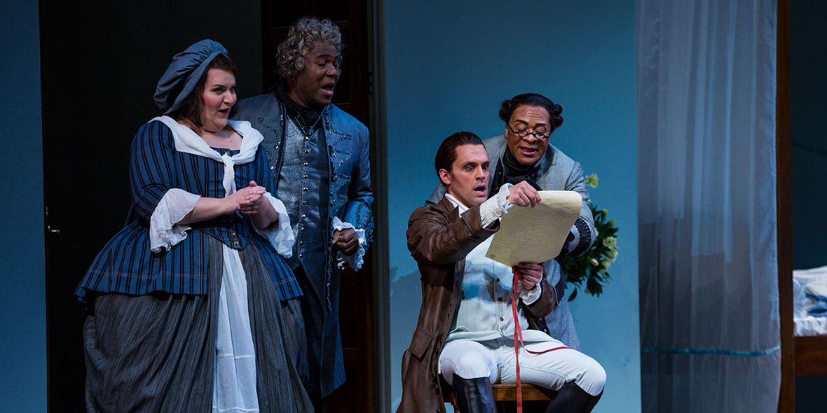 The Countess and Susanna begin to disguise Cherubino. Susanna steps out for a moment. The Count arrives in a jealous fury, having read the anonymous note. He knocks on the bedroom door and finds it locked. The Countess, terrified, hides Cherubino in the closet and then lets the Count in. Susanna re-enters, unnoticed. The Countess refuses to unlock the closet, so the Count leaves, taking the Countess with him, in search of tools to break the lock. Susanna helps the boy escape through the window, and then she hides in the closet, surprising both the Count and Countess when they find her there. Figaro arrives and tries to get everyone to come to the wedding festivities. When the gardener enters and claims someone has jumped out of the window, Figaro takes the blame. Marcellina bursts in with Bartolo and Basilio and demands her case against Figaro be heard.