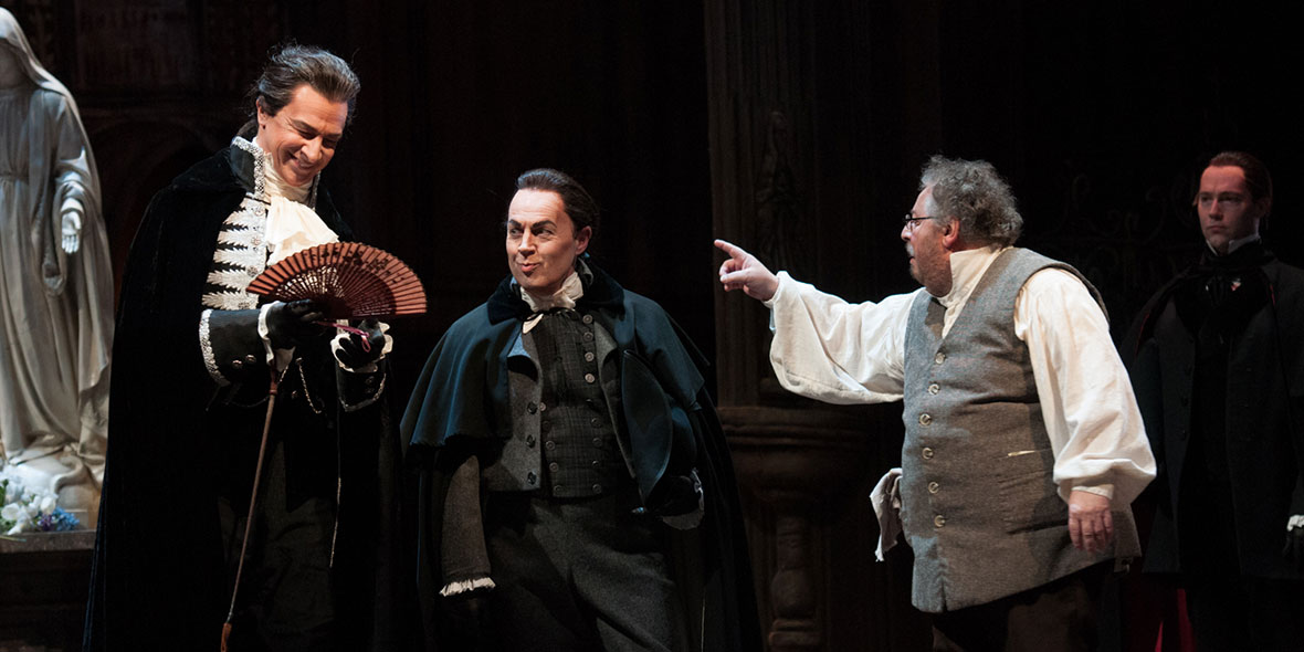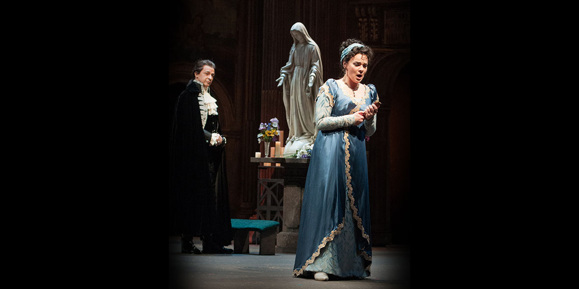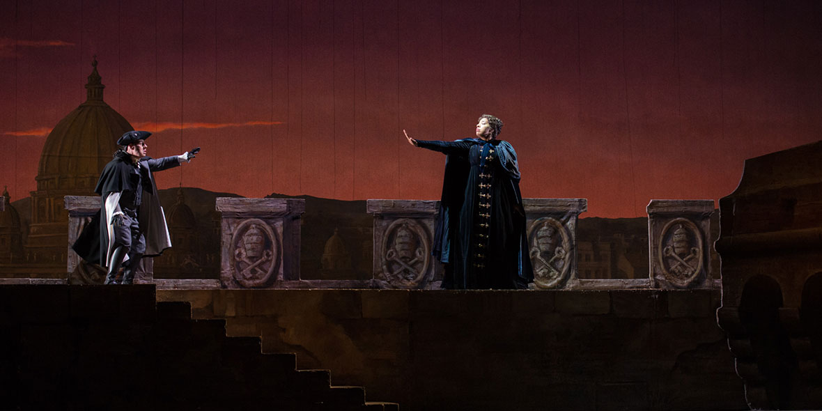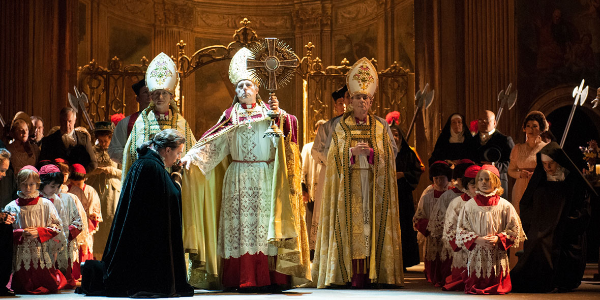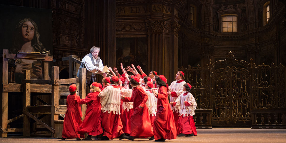 The Sacristan and the acolytes enter, excited about the army’s supposed victory over Napoleon. Scarpia, chief of police, enters, having tracked Angelotti to the church. Tosca returns to find her lover gone. Scarpia sows seeds of jealousy in Tosca, suggesting that her lover is having an affair with the Marchesa. Tosca, crazed with jealousy, rushes out to find the painter. Scarpia sends his minions to follow her, hoping that Tosca will lead them to Cavaradossi and Angelotti. As a joyful crowd fills the church to celebrate Napoleon’s supposed defeat, Scarpia, ignoring the celebration, dwells on his lust for Tosca.